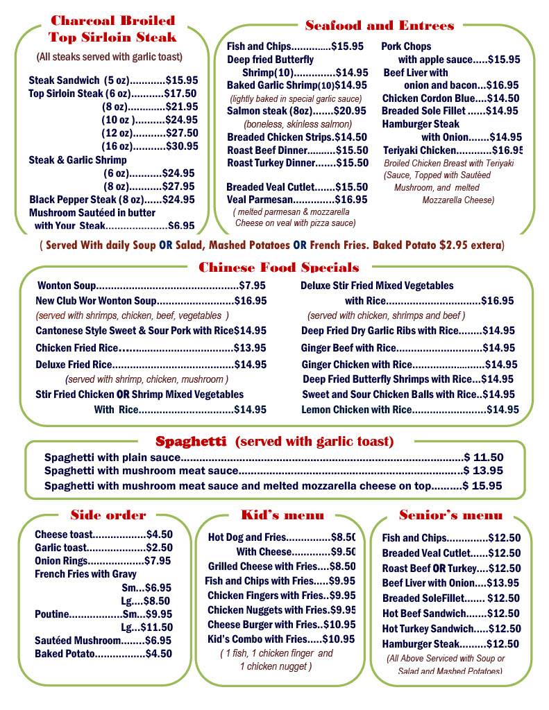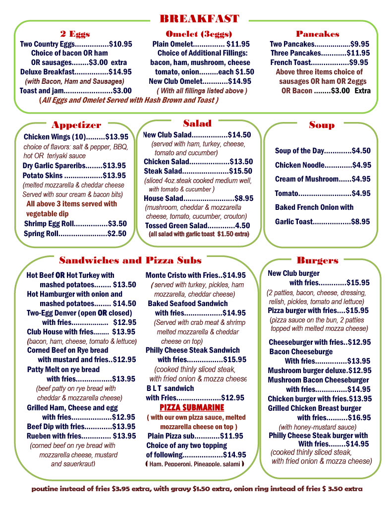 Start your morning with hearty breakfast options like the New Club Omelet, or enjoy simple, satisfying sandwiches and hearty soups that feel just right for a cozy midday break. For lunch and dinner, the menu features family-friendly favorites including fresh salads, comforting beef dip with fries, and a range of sandwiches, subs, and burgers crafted to please all ages.